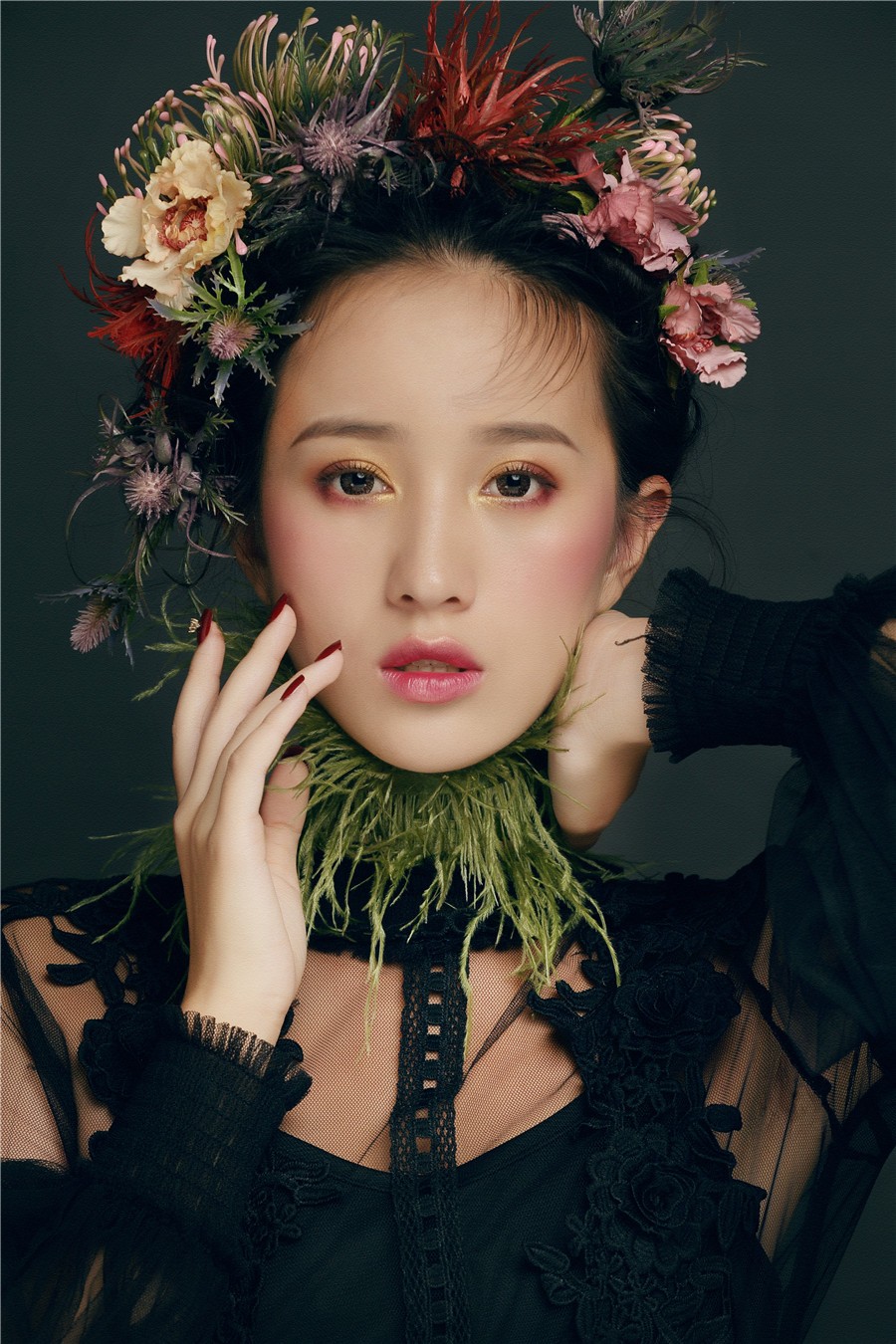 麗竹學(xué)校彩妝作品--復(fù)古油畫風(fēng):飽滿濃郁的妝面色彩,配以仙氣十足森系田園風(fēng),搭上靈動(dòng)的發(fā)絲在陽(yáng)光下跳躍,營(yíng)造出了一種別樣的浪漫氣氛,宛如華中走出的女子。