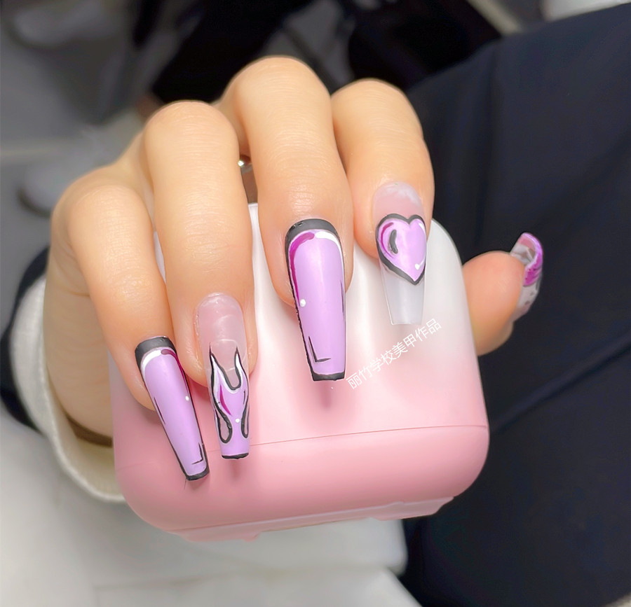 南寧專業(yè)美甲教學(xué)、南寧美甲技術(shù)培訓(xùn):當(dāng)彩繪技術(shù)與卡通形象相互結(jié)合時,相信沒有哪個妹紙會不喜歡吧?下面,就和我們一起來看看南寧美甲師學(xué)校-麗竹美甲學(xué)校學(xué)員繪制紫色彩繪美甲。