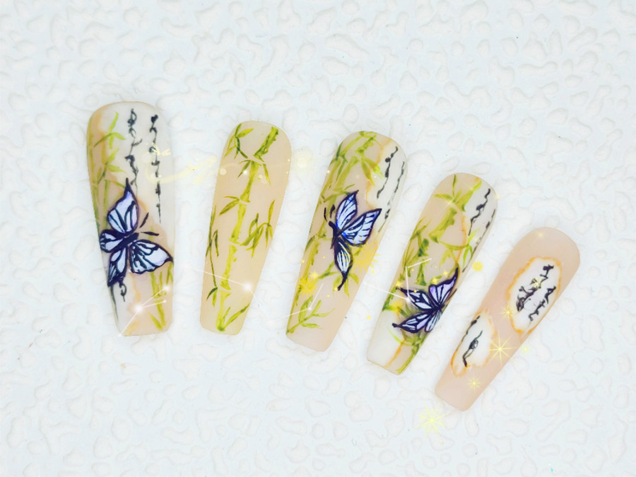 麗竹學(xué)校美甲專業(yè)的同學(xué)們在本次畢業(yè)作品中,就將竹子和蝴蝶以及韻味十足的書法相互結(jié)合,運(yùn)用彩繪的方式描繪出了一幅新中式美甲。下面就趕緊和我們一起去看看吧!