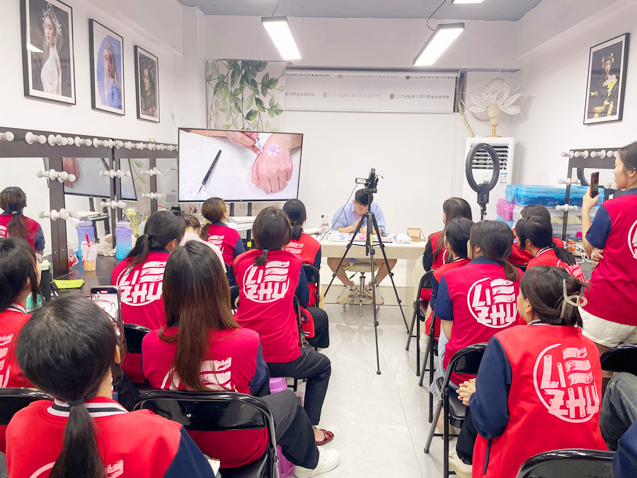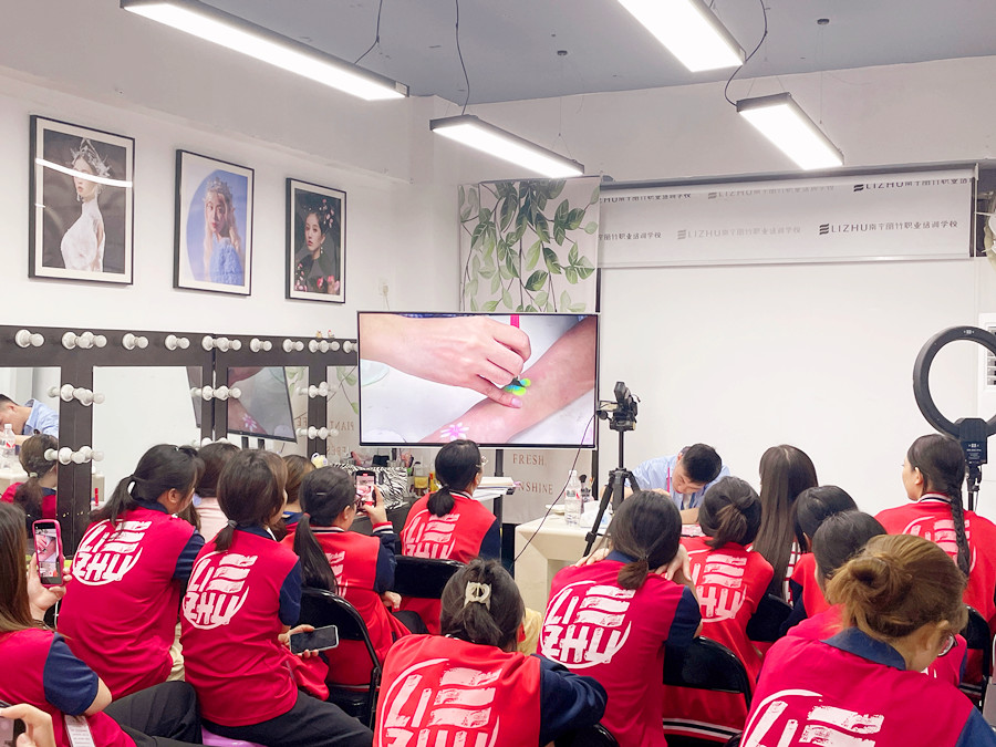 面部彩繪零基礎(chǔ)學(xué)習(xí)、廣西學(xué)面部彩繪:廣西彩妝化妝美妝造型學(xué)校(麗竹彩妝化妝造型學(xué)校)廣西彩妝造型進修班的教室里,玉老師正在一邊給同學(xué)們講解廣西化妝面部彩繪教學(xué)里關(guān)于什么是面部彩繪的內(nèi)容,一邊通過在手上作畫演示彩繪的畫法。