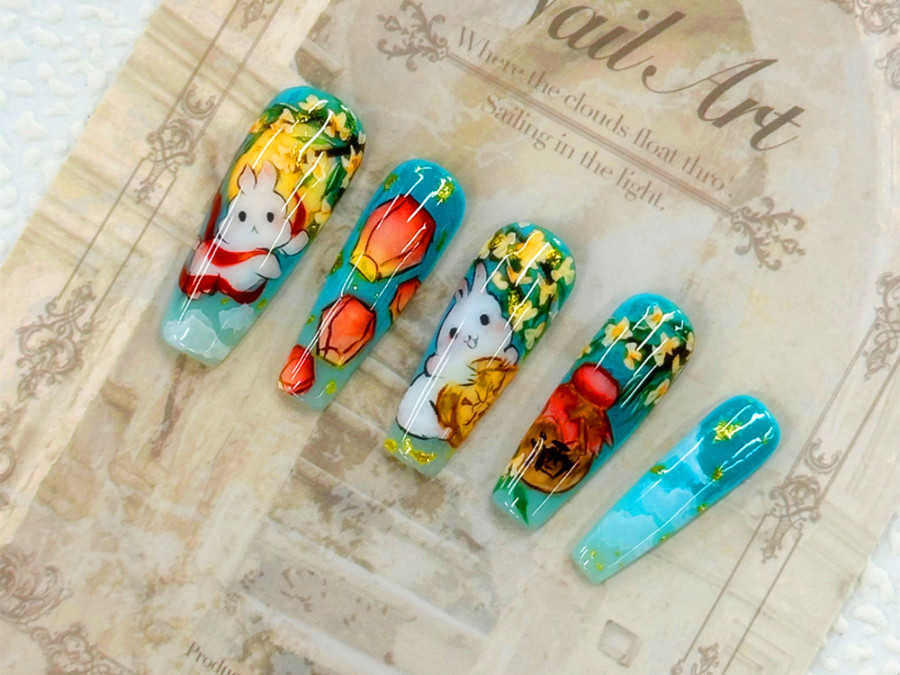 美甲圖片2024新款式、南寧美甲店推薦:說(shuō)起中秋元素,怎么能少得了玉兔,桂花樹(shù),美酒佳肴還有孔明燈呢?在團(tuán)圓之際,不如也讓你的手一起感受中秋的美好吧?