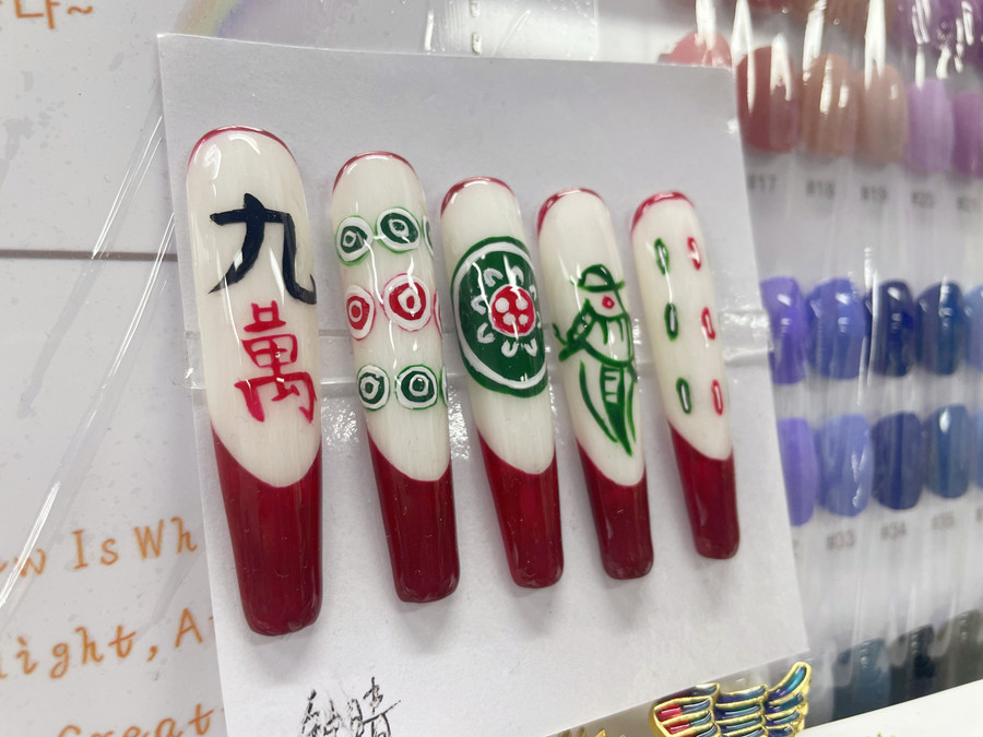南寧美甲訓(xùn)練、南寧美甲作品:面對(duì)成千上萬(wàn)款美甲,身為美甲控的你想好給自己做什么款式的美甲了么?如果還沒(méi)有,南寧美甲職業(yè)學(xué)校推薦你可以可以試試南寧美甲造型進(jìn)修班同學(xué)們繪制的畢業(yè)作品---麻將新年國(guó)粹美甲。